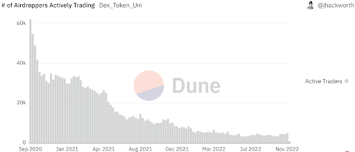 来源:Dune —— @jhackworth / 积极交易的空投者数量