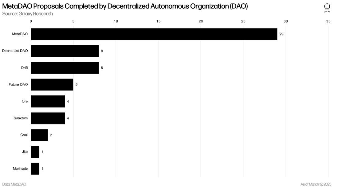 Solana 的 MetaDAO 是治理中第一个大规模实施未来治理的平台,它为 DAO 提供了一个启动未来治理市场的平台,并为用户提供参与投票的平台。自 2023 年 11 月推出以来,该平台已在 9 个 DAO(包括其自身)中 促成 了 62 个未来治理举措,其中 19 个是在大选后完成的。三个最大的 Solana 链上 DAO——Jito、Marinade 和 Sanctum——已经完成了他们在大选后的第一次未来治理,Sanctum 通过未来治理投票 解决了 四项决策。值得注意的是,Sanctum 加入了 Ore,采用 MetaDAO 作为其主要的治理运营平台,完全致力于未来治理。