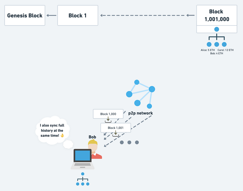 如果區塊鏈越長、包含越多交易,新節點加入網路後要進行完整的同步就越耗時。因此使用者的新節點在加入的時候可以選擇做一些 Trade-off,犧牲一些安全性來更快獲得最新狀態,因為使用者可能沒辦法等上好幾天甚至好幾個禮拜的時間才能知道自己當前在鏈上有多少錢。這個 Trade-off 大致的 做法 是向 p2p 其他節點索取某個區塊執行完後的完整狀態(每個地址的狀態),並在未驗證這個區塊及其內容的有效性之前,就先相信這個狀態並接著索取該區塊之後的新的區塊資料來計算新的狀態,並同時索取該區塊之前的區塊來驗證該區塊的有效性。如此節點就可以很快速地計算出最新的狀態來讓使用者查詢,並在背景慢慢同步並驗證。