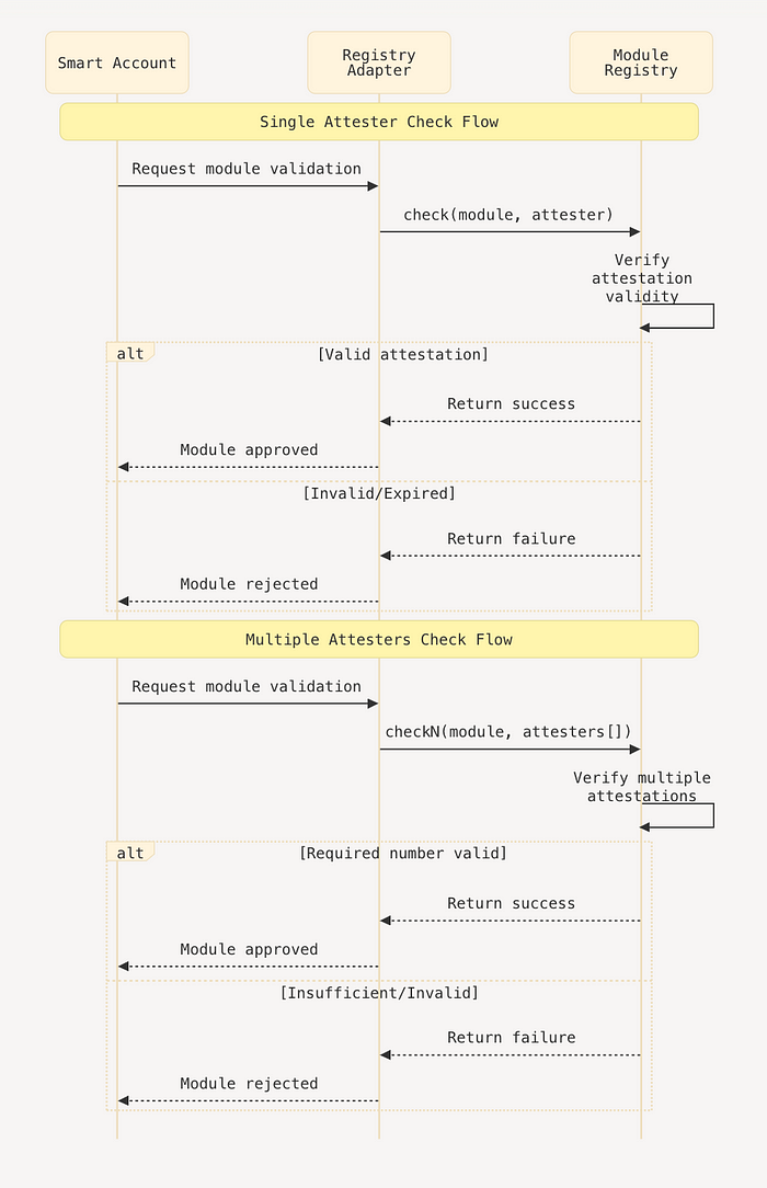 AttestationData: 存储关于证明的详细信息,包括证明者、模式(例如,“securityAuditPassed”)、数据和到期时间。attest: 允许证明者提交证明。revokeAttestation: 允许证明者撤销他们的证明。getAttestations: 返回模块的所有证明。isAttested: 检查特定的证明者是否已证明模块的给定模式。check 和 checkN: 分别验证来自一个或多个证明者的证明。模块注册表的一个简化实现: