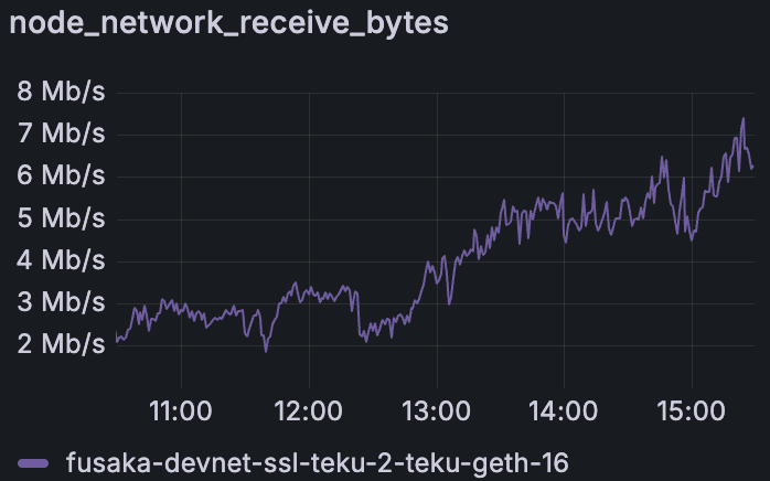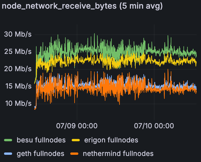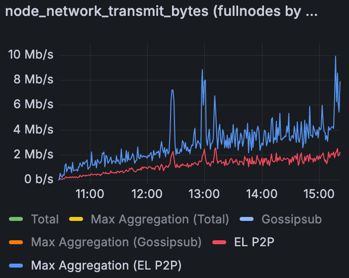 重要的是要注意,我们的数据收集间隔(和 Prometheus 指标)会随时间平均,因此极其短的突发可能会被掩盖。例如,在每个 slot 开始时,会在几百毫秒内交换大量 gossip(blob 公告等)。这些突发可能会瞬间飙升至 30 Mbps 以上,但由于我们以较长的时间段进行采样,因此记录的值仍然可能显示在阈值以下。因此,可能存在比图表明确显示的更多的短暂突发活动。