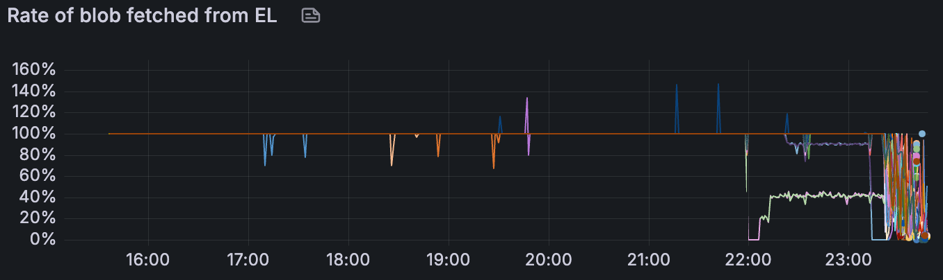 在 lighthouse-nethermind-3 中,我们观察到在网络变得不稳定之前,getBlob 命中率较低(我们尚未找出原因)。