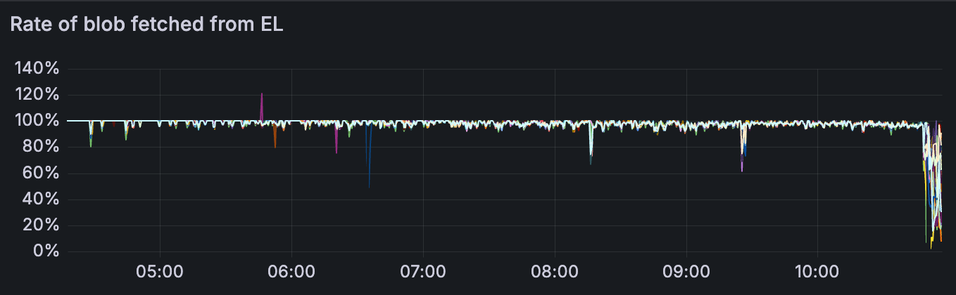 对于带有 getBlobs 的网络,节点大多显示 100% 的 getBlob 命中率,直到网络变得不稳定。