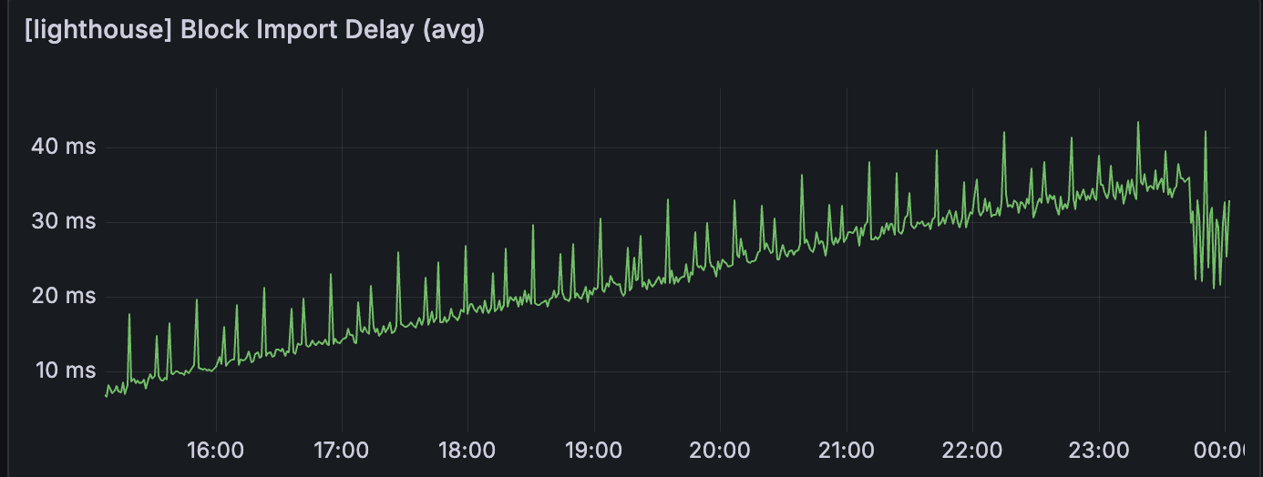 ,表明区块变得可证明的速度较慢。当值超过 8 秒时,我们看到网络变得不稳定。使用 getBlobs,区块在 slot 时间中较早导入。