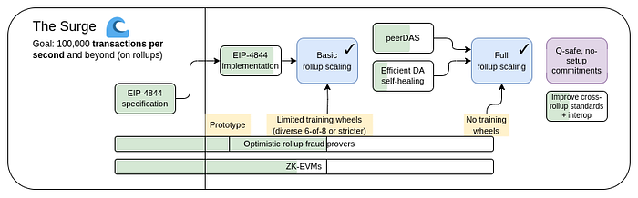 The Surge(巨浪):专注于大规模提高可扩展性,主要通过 Layer 2 rollups 和数据分片/可用性技术,目标是每秒 100,000+ 笔交易 (TPS)。