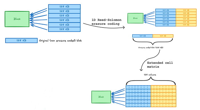 数据重建: 由于 1D RS 编码(通常每个 blob 扩展2 倍),节点需要获取至少 50% _列_对应的数据,才能重建 整个 原始数据矩阵(所有原始 blobs)。如果节点需要完全重建但抽样比例小于 50%,则可以使用对等点发现机制从负责的对等点处请求缺少的列。
