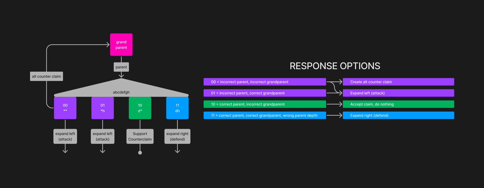 进一步二分的移动被称为攻击或防御。因为声明的轨迹索引是有序的,所以如果不同意父声明,我们可以移动到父声明承诺的轨迹范围的中点,或者如果同意父声明但深度不正确,则可以移动到父声明的右侧同级承诺的轨迹范围的中点。如果我们同意父母但不同意祖父母,则我们什么也不做,因为父母是我们本来会提出的声明(如果它不存在)。
