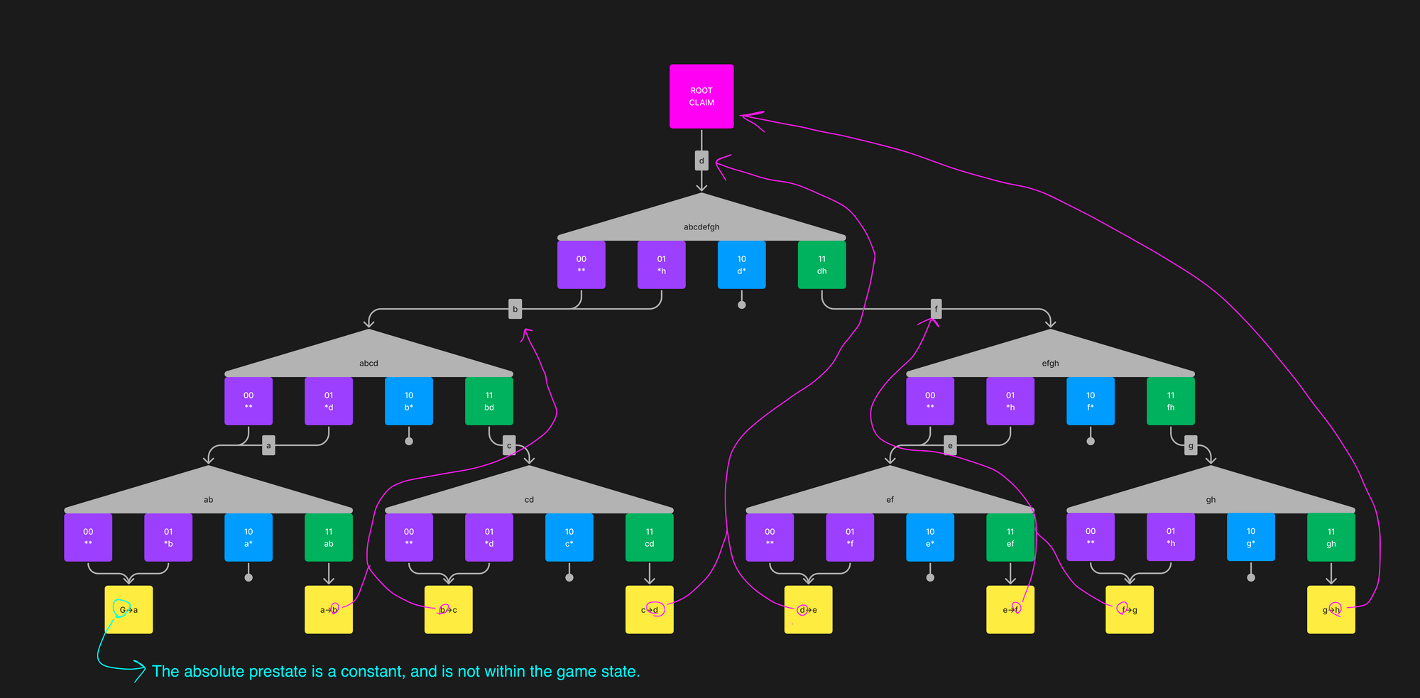 有一个特殊的规则,即如果承诺轨迹索引 0 的声明被攻击,则 prestate 是绝对 Prestate。绝对 prestate 作为可信的初始状态嵌入到 VM 的设置状态中。