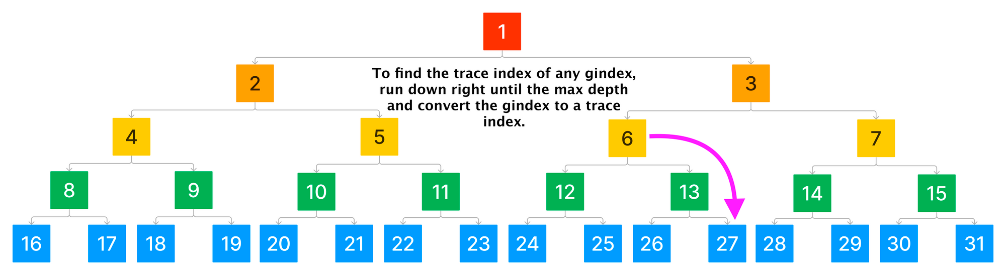 所有位置也可以转换为轨迹索引,轨迹索引是声明所承诺的轨迹中指令的索引。可以通过一直向右运行直到达到叶节点,然后从节点的广义索引中拉出iii(取消设置其最高有效位)来找到位置的轨迹索引。