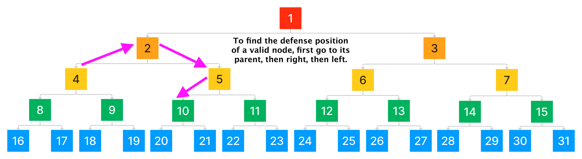 防御类似于遍历到被防御声明的右侧同级的左子节点。这使我们到达一个位置,该位置承诺父节点的右侧同级轨迹的一半。
