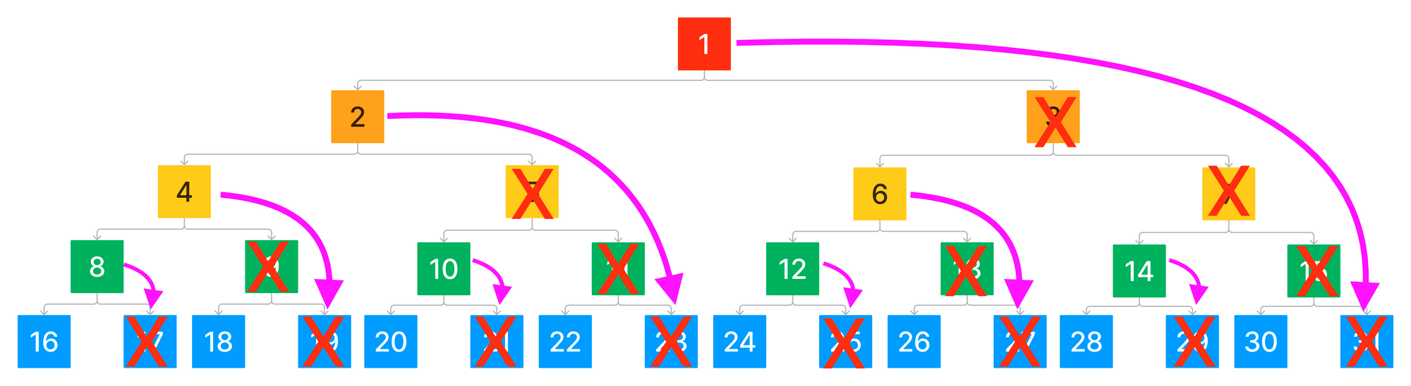 你可能会注意到,由于这两个移动的定义,某些位置可能永远不会在二叉树中遍历到。这些位置在树中具有互补的、有效的、具有相同轨迹索引的位置。我们可以验证所有轨迹索引在游戏内是否具有有效的移动: