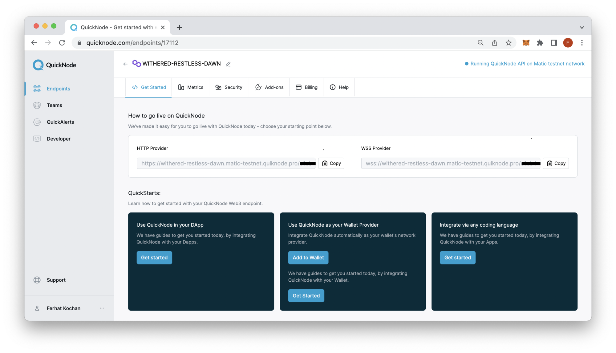 要部署我们的 NFT 市场合约并与之交互,我们需要一个连接到 Polygon Mumbai 测试网的完整节点。你可以通过查看 Polygon 文档上的 节点 选项卡来运行你自己的节点。但是,这有时可能难以管理,并且可能不如我们希望的那样优化。相反,你可以轻松地 在此处 设置一个免费的 QuickNode 帐户,并可以访问 20 多个区块链。QuickNode 的基础设施针对延迟和冗余进行了优化,使其比竞争对手快 8 倍。你可以使用 QuickNode 比较工具 来针对 QuickNodes 节点对不同的 RPC 进行基准测试。