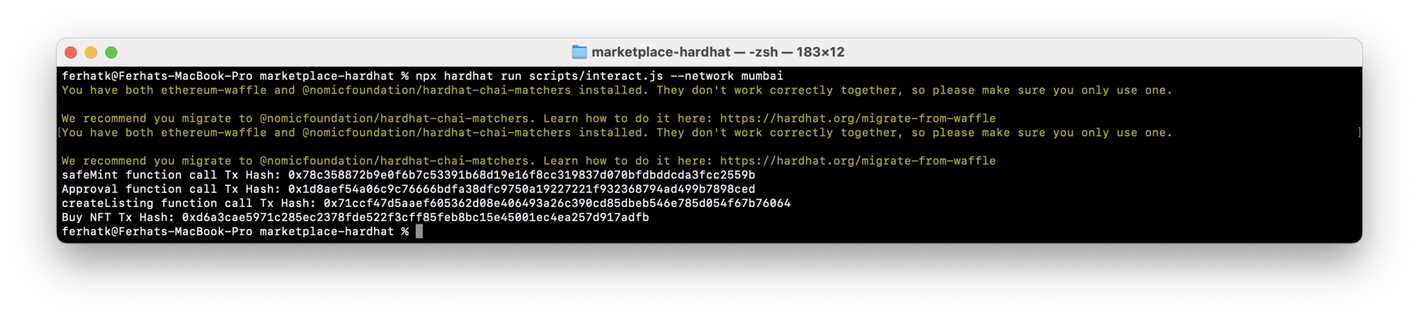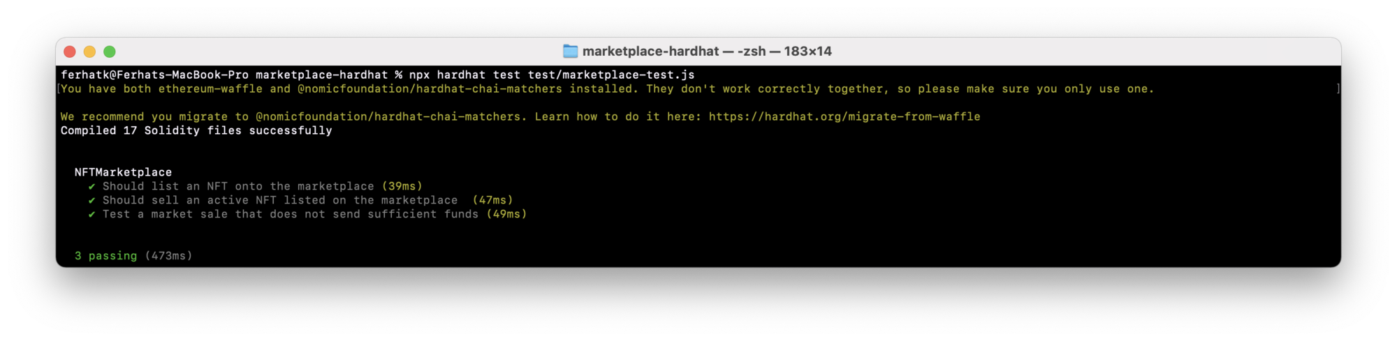 要运行上面的测试脚本,请运行此终端命令:npx hardhat test test/marketplace-test.js。