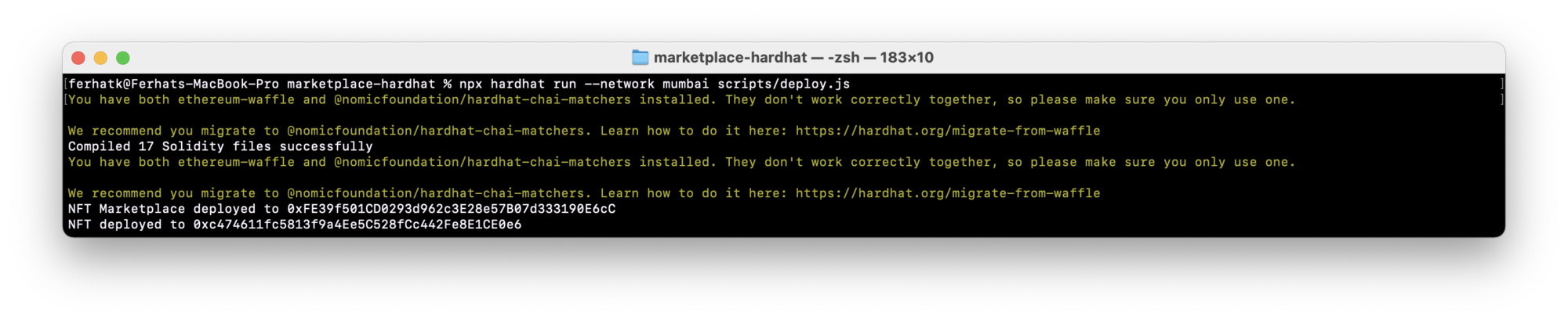 你刚刚将你的市场合约和 NFT 代币部署到 Mumbai 测试网!花点时间通过转到终端中提供的 URL 在 Polygonscan 上验证交易。在下一节中,我们将使用 Javascript 和 Ethers.js 与我们的市场智能合约交互。