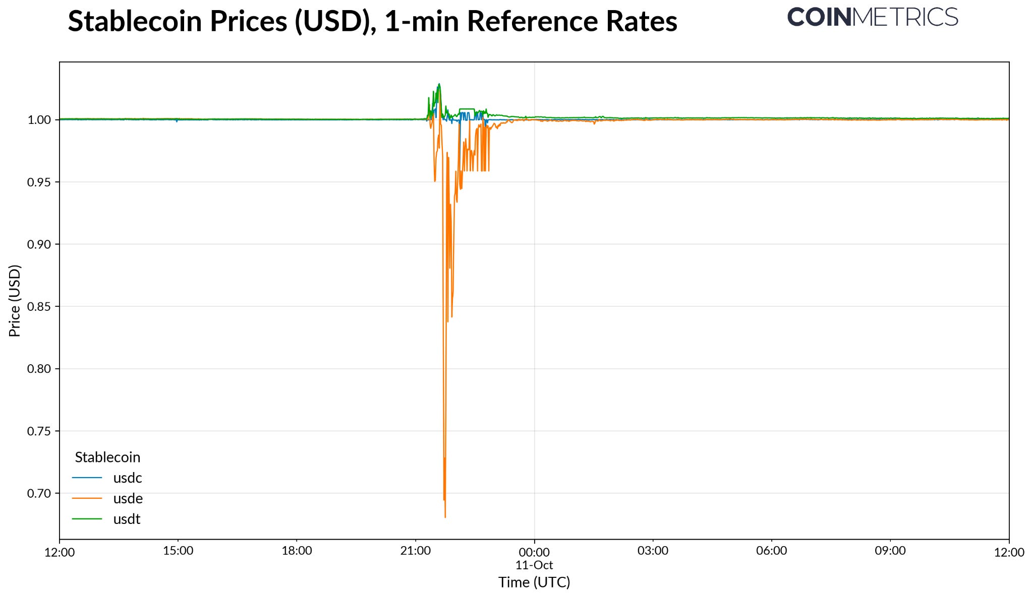 在崩盘期间,USDe 曾一度跌至 0.67 美元的低点,而 USDT 和 USDC 等法定货币支持的稳定币的交易价格略高于面值。