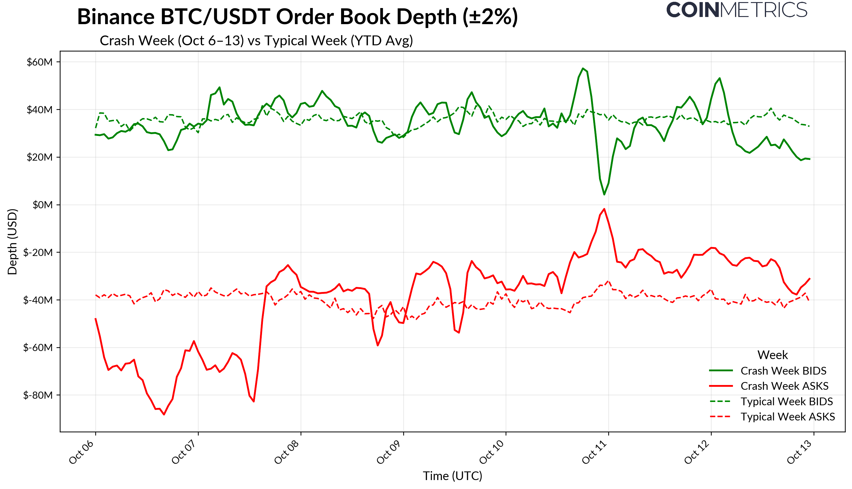 市场流动性不足进一步加剧了剧烈的清算。这可以在币安的 BTC/USDT 订单簿深度数据中观察到。下图显示了崩盘周(10 月 6 日至 13 日)相对于年初至今 (YTD) 平均水平的 BTC/USDT 深度,范围为中间价格的 ±2% 以内。