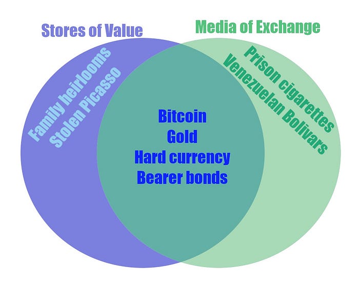 然而,中间远非空无一人。在那里,你会发现真正的好东西,例如黄金、不记名债券、硬通货,当然还有比特币。使它们如此出色的原因是它们具有SoV和MoE的双重属性。这些资产或多或少是可替代的、便携的且可分割的,就像好的MoE一样。而且它们的价值是持久的,就像好的SoV一样。