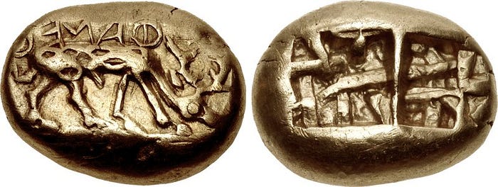 以弗所人在2600年前将黄金视为SoV和MoE,并且这种想法根深蒂固,以至于即使在今天,视频游戏中的金钱也经常被描绘成金币。 [图片:Classical Numismatic Group, Inc.]