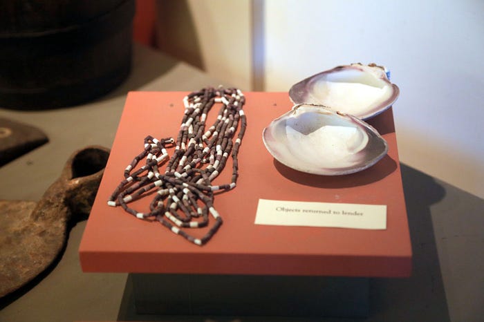 然后在1622年,一位名叫Jacques Elekens的荷兰商人劫持了一位Pequot酋长(就像一位酋长)为人质并要求赎金。这位酋长的族人给Elekens送来了280码(约256米)长的白色和紫色珠子,这些珠子是用蛤蜊壳制成的——贝珠。显然,他们以前并没有真正使用贝珠作为现金,即使在这次事件中,赎金也主要具有象征意义,就像通过发送一个奇特的仪式权杖来赎回一位王子一样。