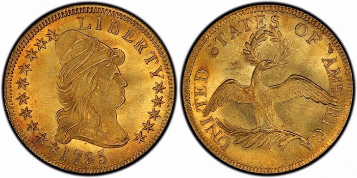创造货币的权力被载入美国宪法,并且1792年的铸币法案将新美元的价值与西班牙银元和416格令的固定数量的白银Hook。“鹰”实际上是价值10美元的Coin,其中包含270格令的黄金。