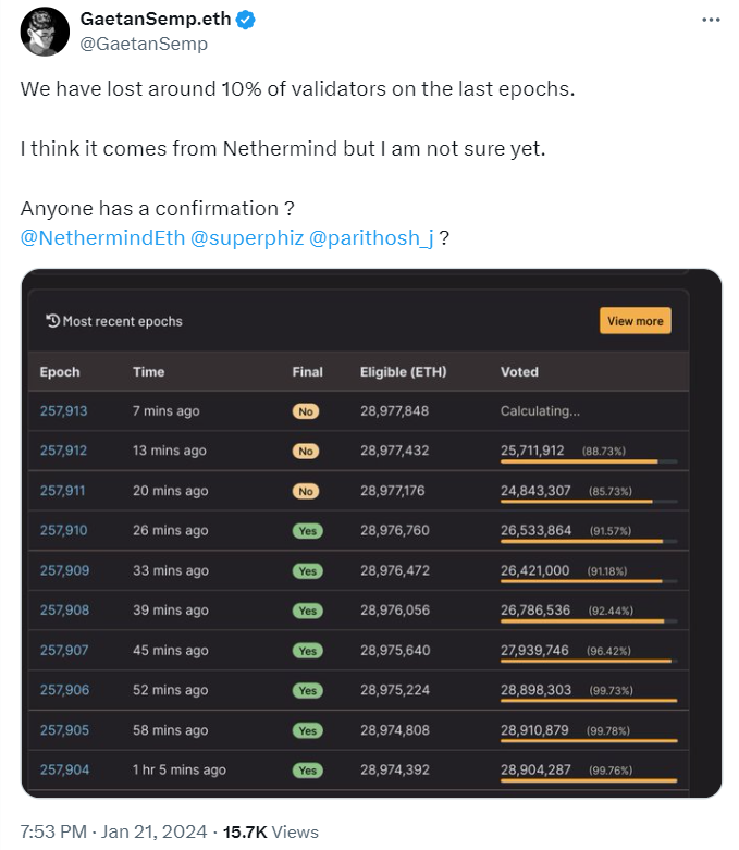 2024 年 1 月 21 日,客户端软件 Nethermind 经历了一个问题,其中 大约 8% 的以太坊权益证明 (PoS) 交易验证者在发布 Netherland 的 v1.23.0 更新后突然开始生成无效区块。