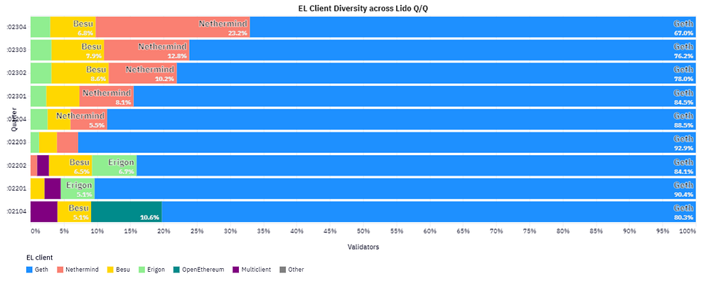 Lido Finance 于 2024 年 1 月 23 日宣布,他们认真承诺减少对超级多数客户端 Geth 的依赖。从 2022 年的 93% 使用率,他们已将其降至 67%