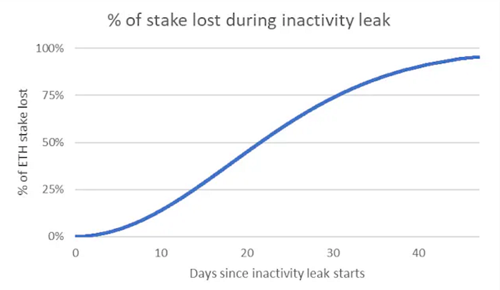 当验证者停止最终确定 4 个 epoch(大约 25 分钟)或更长时间时,会触发“非活跃泄漏”,然后离线验证者会看到他们质押的以太坊以惊人的速度消失。
