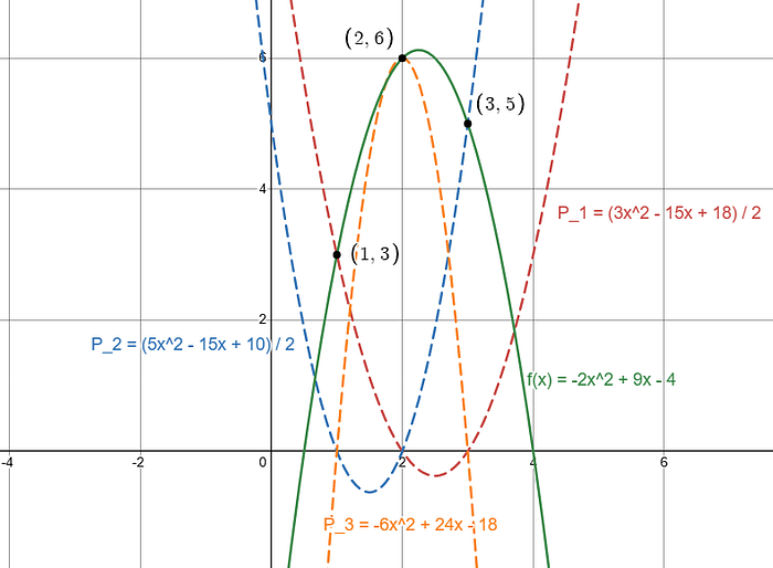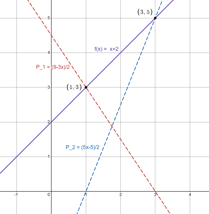 通常,最小阶数比点数少一。 然而,在极少数情况下,这些点可能会完全对齐,从而允许使用较低阶的多项式。 例如,在我们之前的示例中,在 (2,4) 处添加第三个点仍然允许同一条红线插值所有点。