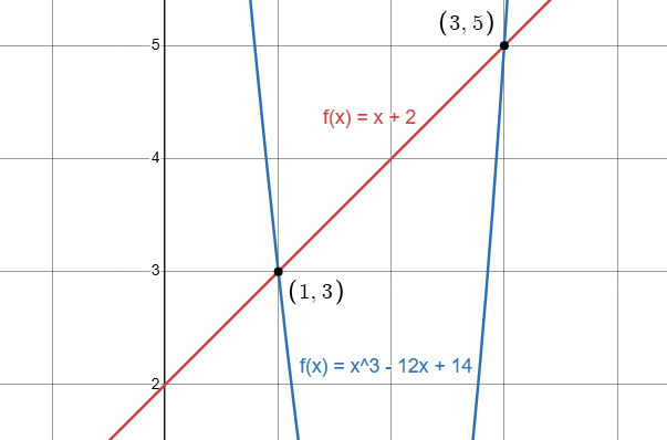 例如,假设我们有 (1,3) 和 (3,5) 这两个点。 我们稍后将详细介绍如何执行插值,但现在,这里有两个通过这些点的多项式:f(x) = x + 2 和 f(x) = x^3 — 12x + 14。