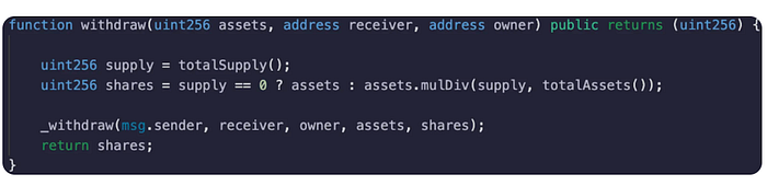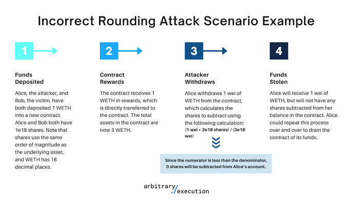 在我们合约的上面的代码片段中,我们看到用户可以指定他们想要提取的底层资产的数量。 然后,该函数使用计算来确定要从用户那里扣除的相应份额数量。 但是,通过向下舍入,该函数为攻击者操纵合约提供了机会。 如果攻击者提供他们想要提取的资产数量,使得计算出的份额数量向下舍入为 0,那么他们实际上是免费提取了资产(请记住,如果分子小于分母,Solidity 会舍入为 0)。