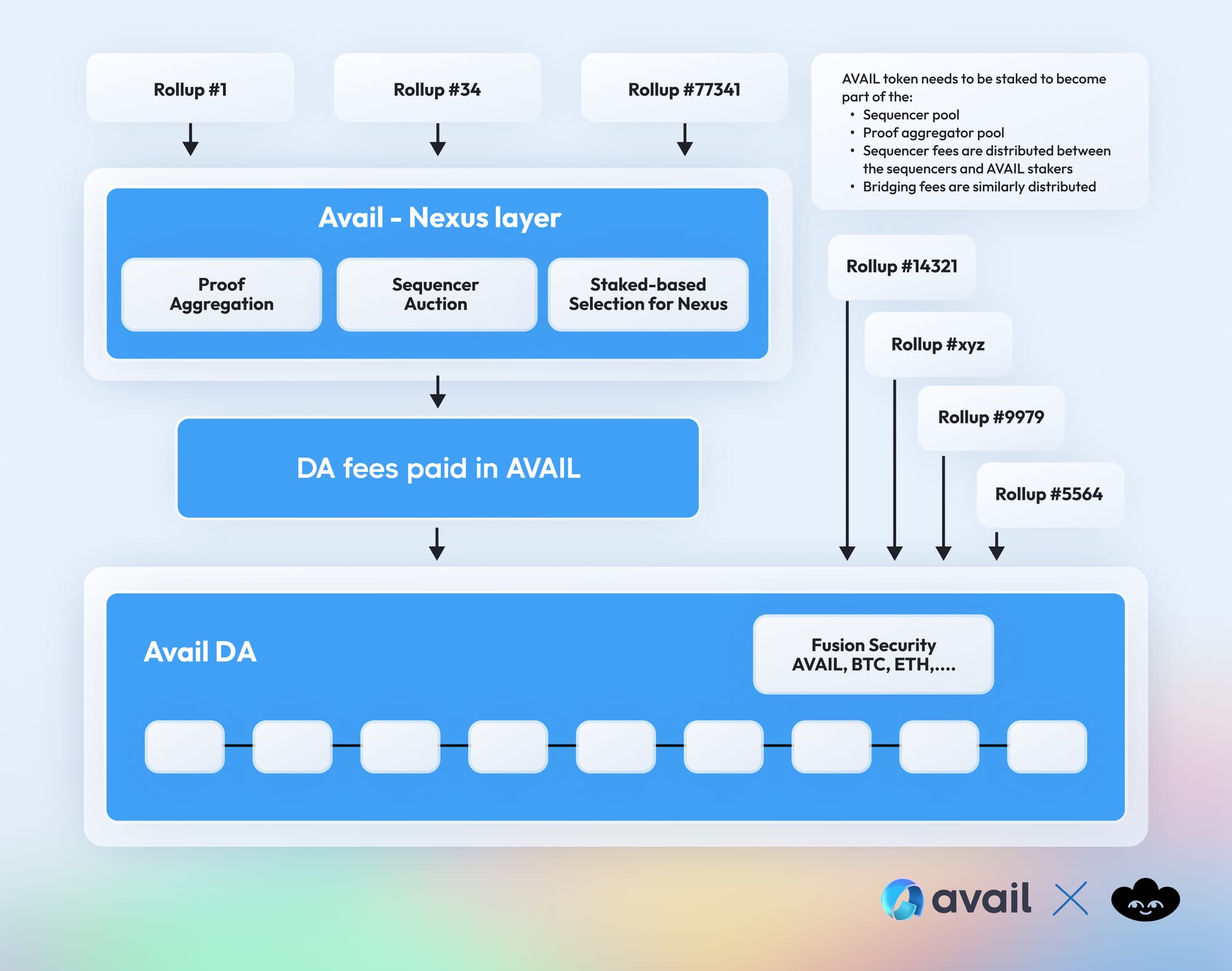 作为 Avail 路线图 的一部分,Nexus 将有助于促进网络之间的跨链通信。 对于像 Lens 这样的合作伙伴来说,这可能意味着为用户提供无缝的跨链体验,使他们能够利用来自多个网络的功能和代币。 Avail Fusion 将为网络提供额外的密码经济安全性,其中 ETH、BTC 等额外的代币将与原生 AVAIL 代币一起为 Avail 共识做出贡献。
