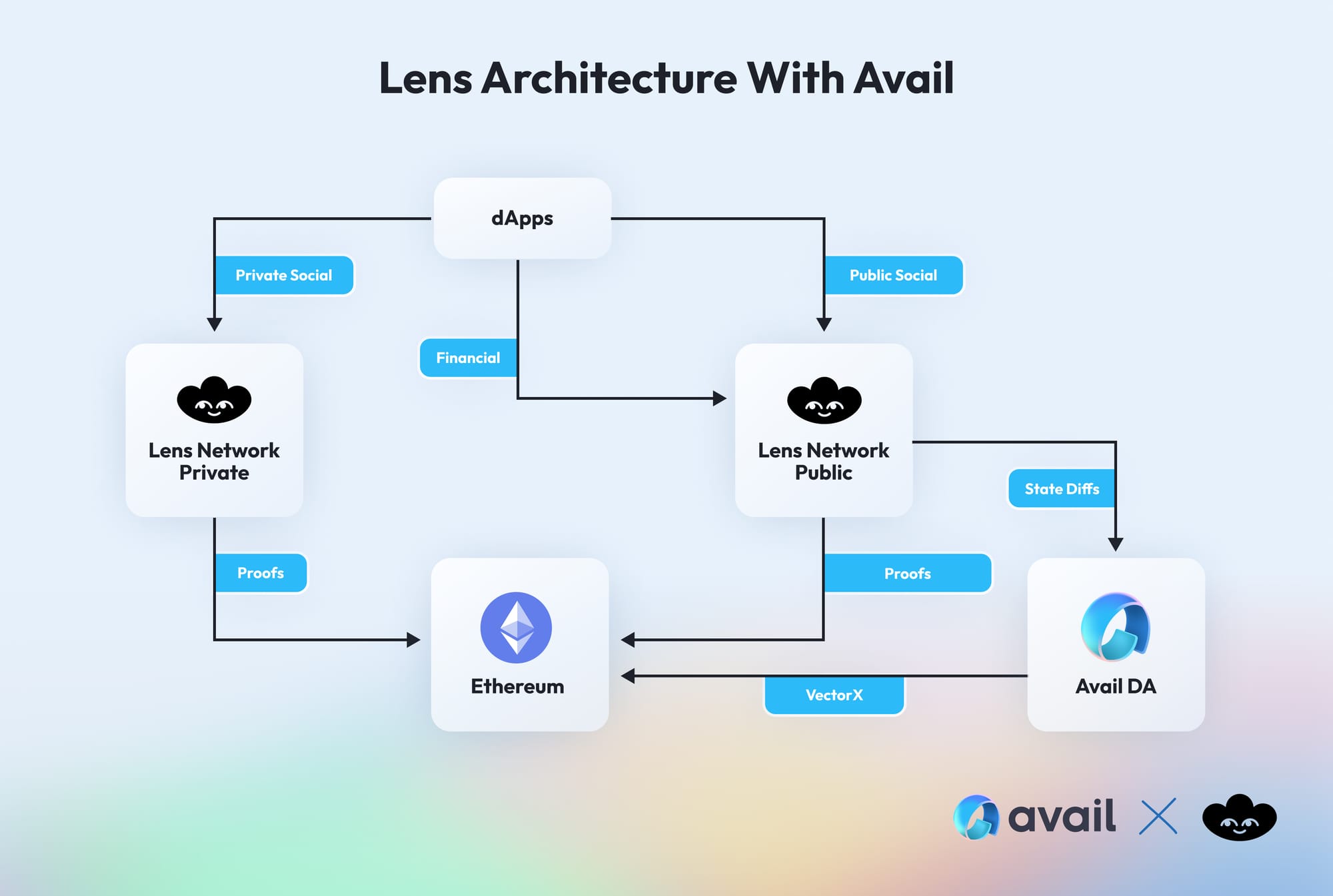 DA 证明可以通过 VectorX(一种将数据根发送到 Ethereum 的零知识桥)在 Ethereum 上进行验证。 这可用于在 Ethereum 上验证 Avail 验证器是否已就提交的数据 blob 达成共识。 这有助于 Lens 降低成本,这对于对定价敏感的用例(如社交媒体)非常重要。
