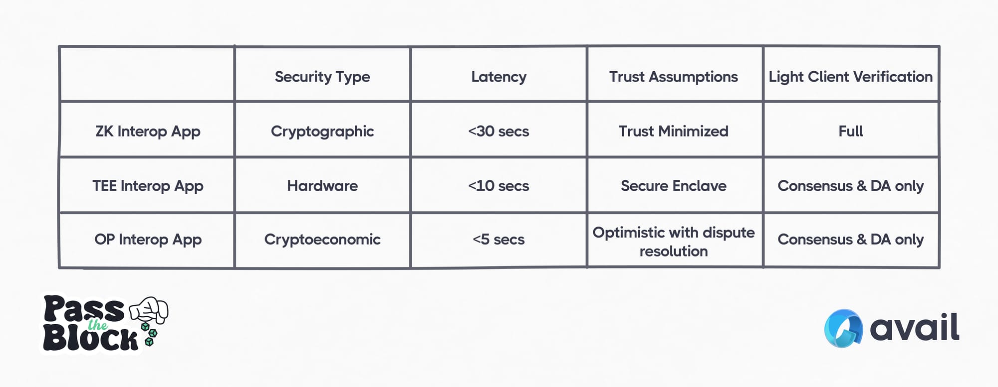 对于更快的跨链交易,OP-Interop App 提供了一种替代方案,但具有额外的信任假设,而 TEE-Interop 通过利用安全硬件提供了一种安全中间地带。