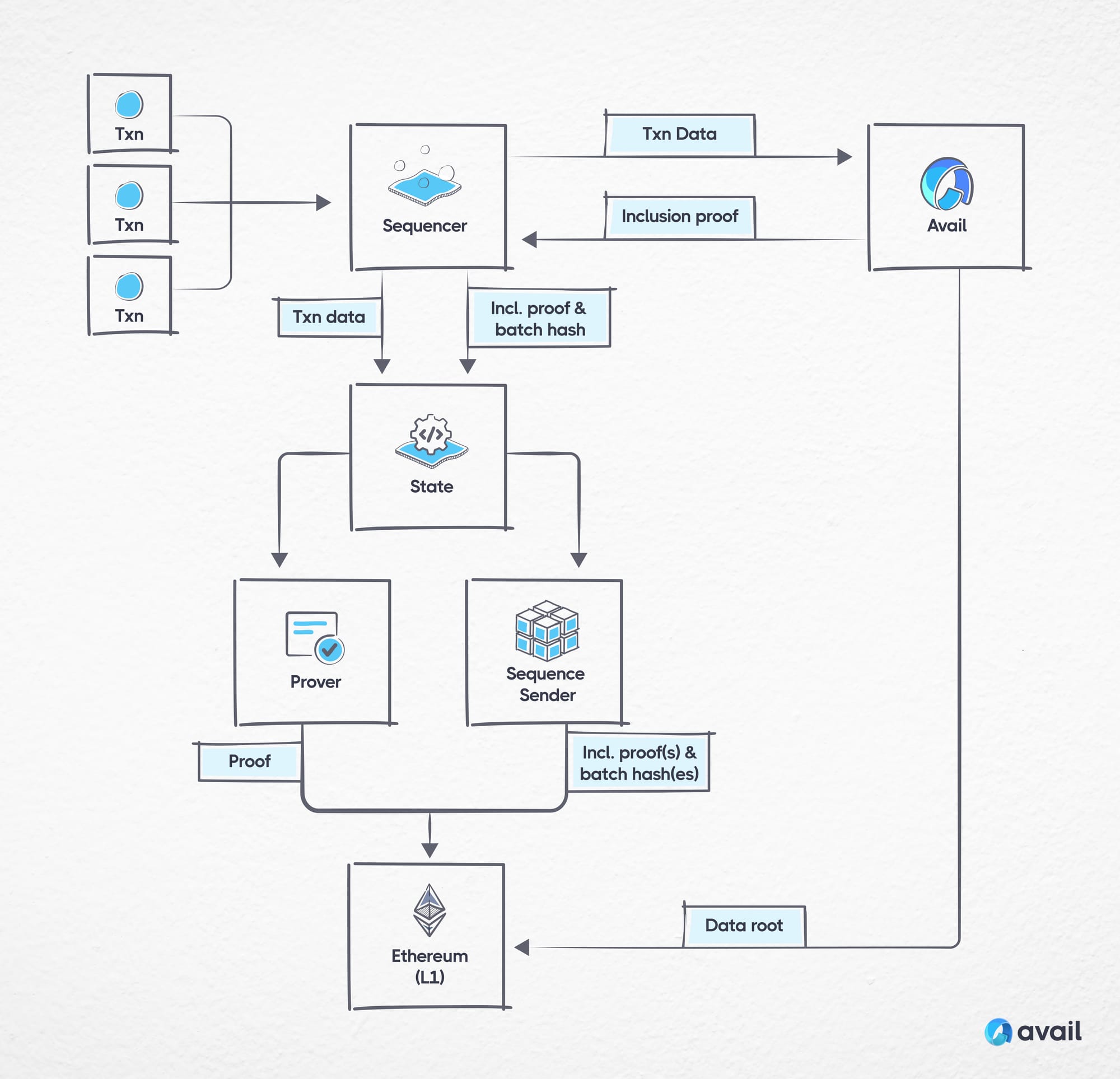 数据根通过 Vector 数据证明桥 从 Avail 发送到以太坊。这使得 Validium 排序器可以在以太坊上验证 Avail 的验证器是否已就数据的可用性达成共识。一旦序列发送者收到确认,确认给定批次的交易的数据根已成功发布到以太坊,则可以提交该批次。排序器将包含证明提交给以太坊。