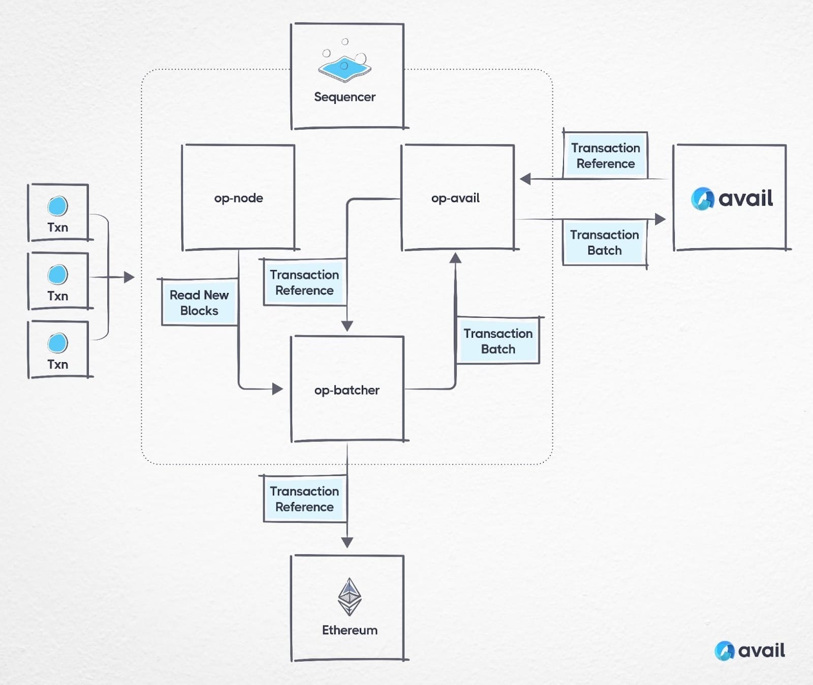 交易被提交到 Avail OP Stack 中的排序器节点。然后,op-batcher 将交易批次提交给一个名为 op-avail 的模块,该模块已被添加以将数据提交给 Avail。