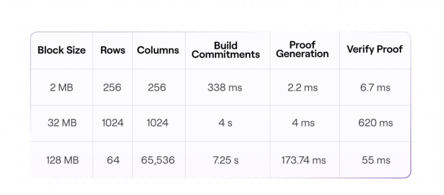 而且,还有足够的计算空间可以将区块大小增加到 32 MB 以上。一个尺寸为 64x65,536 的 128 MB Avail 区块需要 7.25 秒来生成承诺,174 毫秒来构建证明,以及 55 毫秒来验证证明。