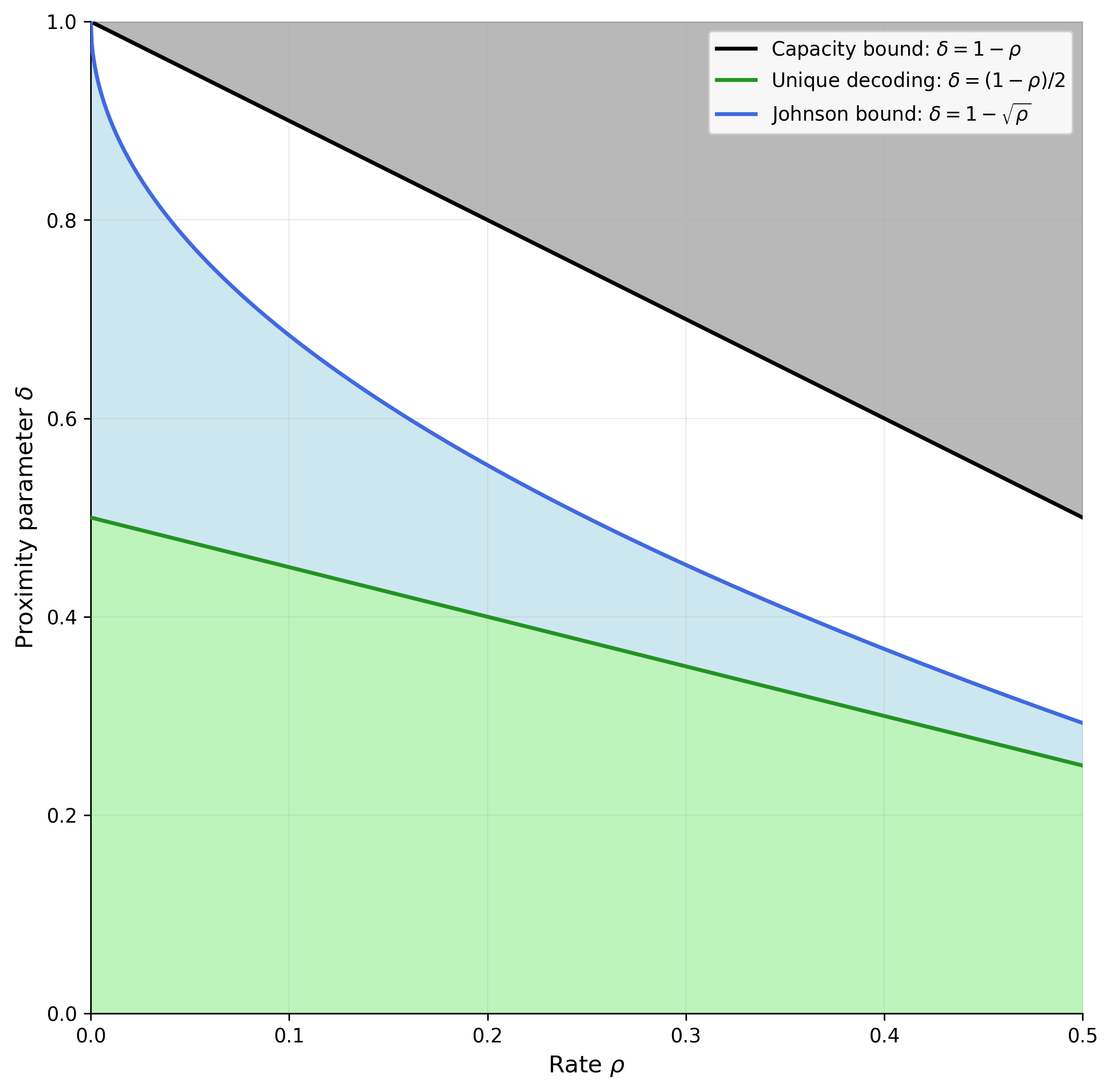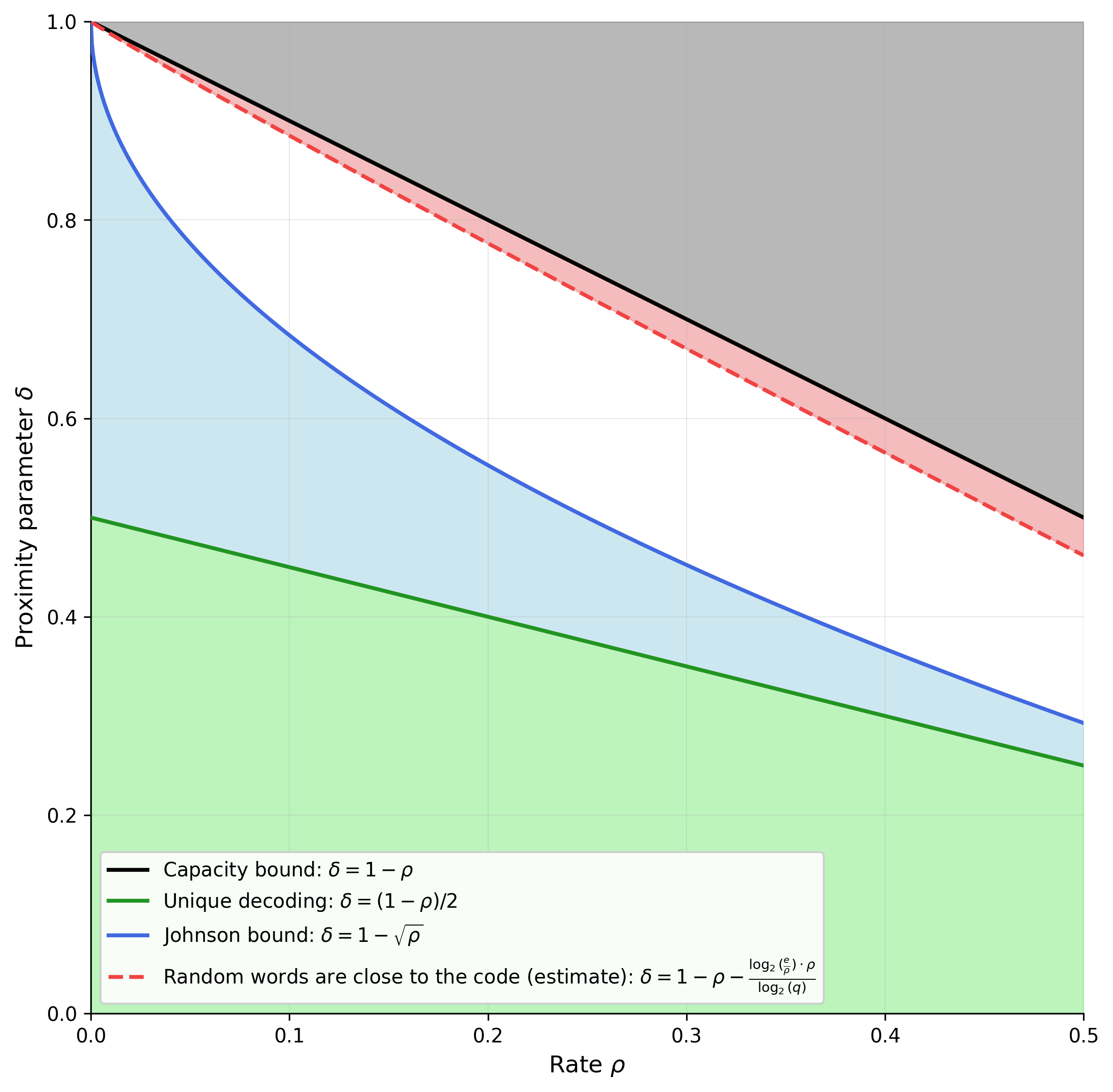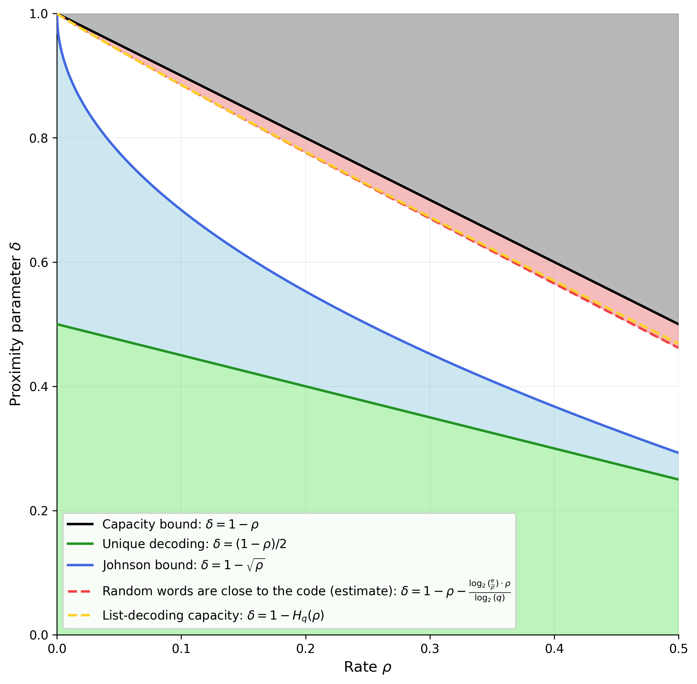 • 绿色和蓝色区域表示我们对其安全性有数学证明的参数集。这两个区域中的参数都保证邻近测试的输入要么 δ-接近代码,要么以高概率被拒绝。此外,绿色区域中的参数保证测试的输入接近唯一的码字。