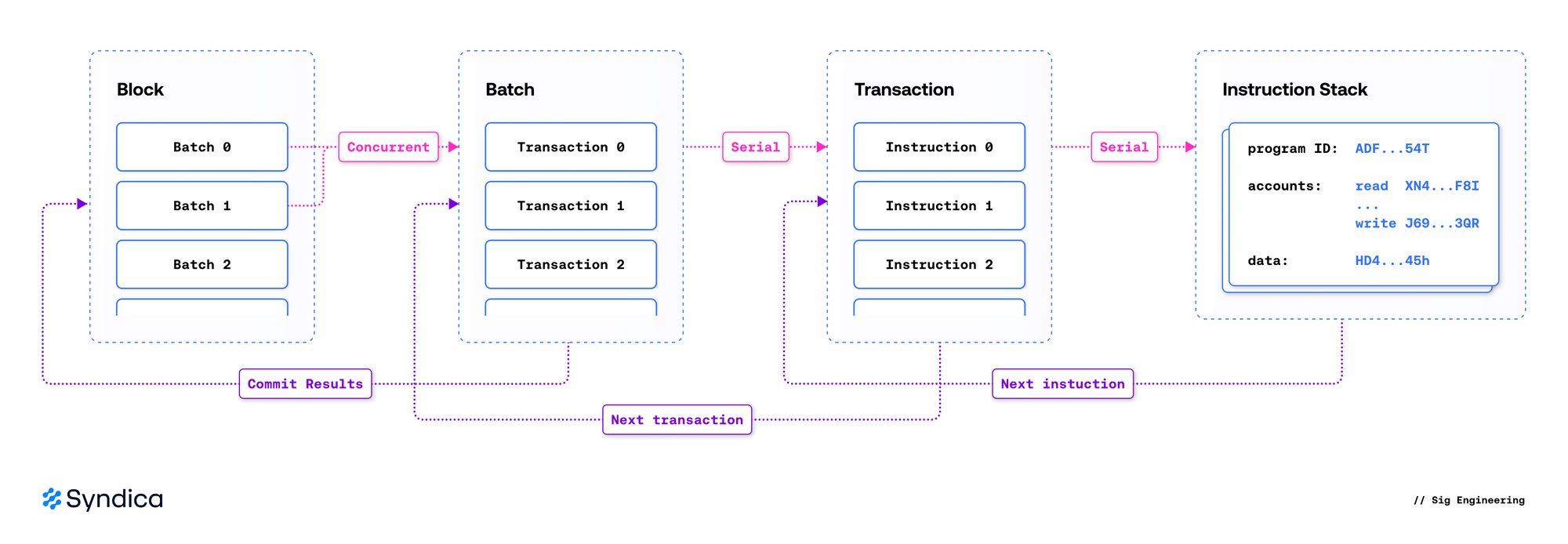 运行时的结构反映了 Solana 账本的结构:区块包含交易,交易包含指令。它可以根据它们操作的范围大致分为三层:
