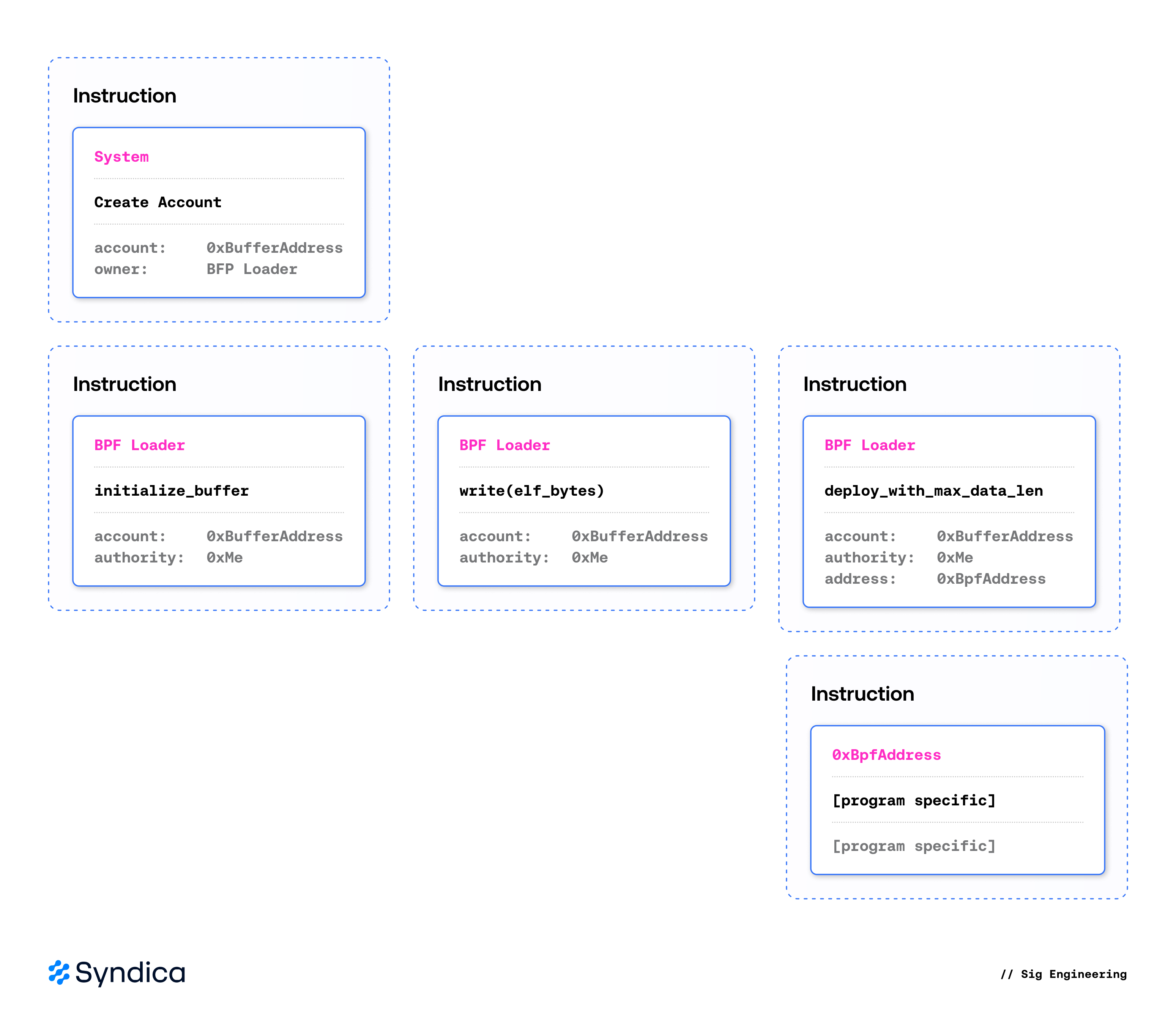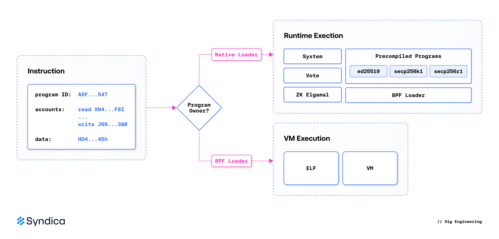 对于本机程序,此过程很简单,因为它们是直接在验证器运行时中实现的。在 Sig 中,本机程序通过使用所需的指令调用 executeNativeCpiInstruction 来执行 CPI。但是,对于 sBPF 程序,事情变得更加复杂,因为必须在运行时和执行当前程序的虚拟机之间转换指令及其结果。sBPF 程序通过两个系统调用之一触发 CPI——sol_invoke_signed_rust 或 sol_invoke_signed_c——它们使用指令的 VM 表示,将其转换为运行时的内部格式,验证权限,并将其推送到指令堆栈上以供执行。