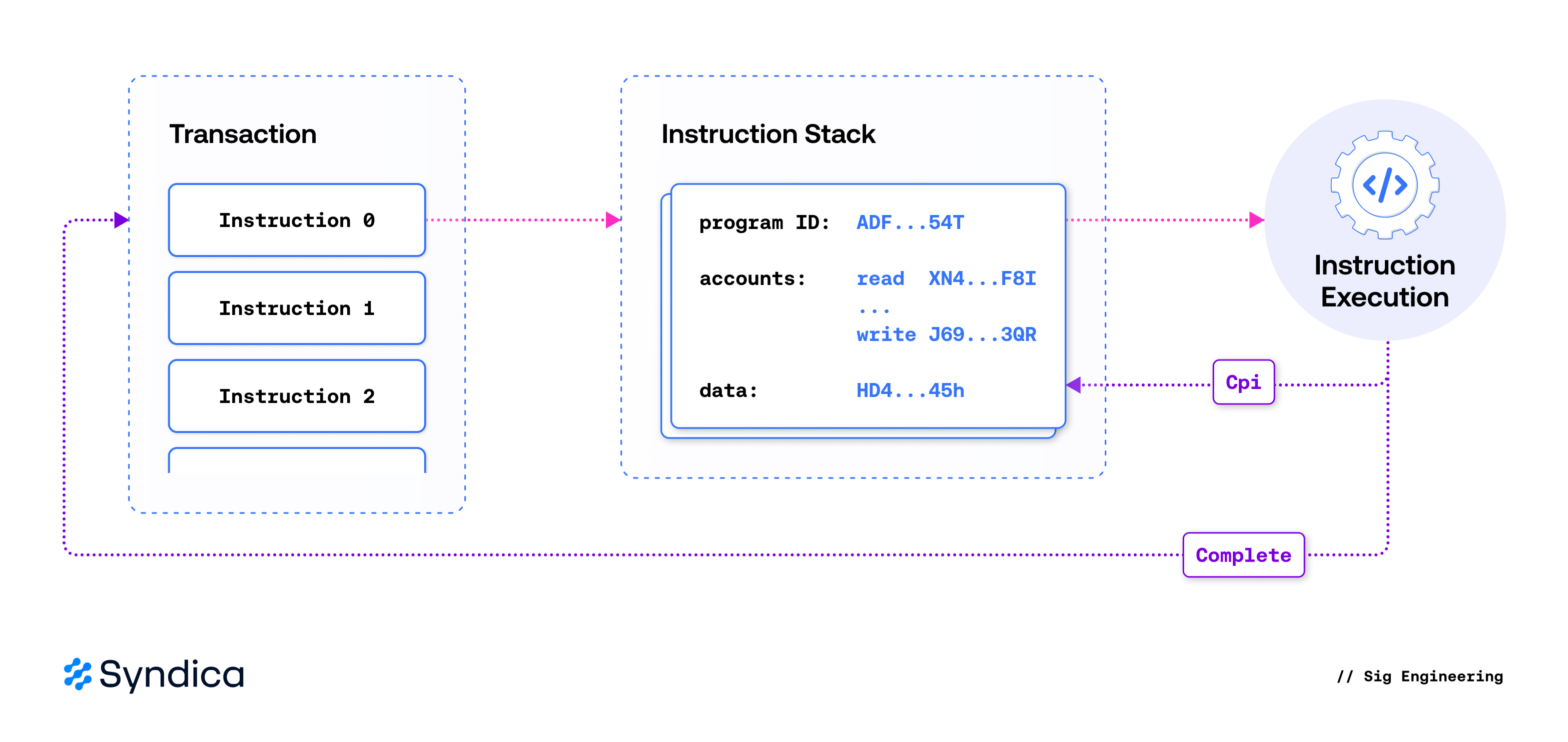 如前所述,交易包含描述指令处理器执行的程序调用的指令。Solana 通过允许程序通过称为跨程序调用 (CPI) 的过程来调用其他程序,从而扩展了此模型。这种机制使程序能够相互交互和组合,从而允许从较小的模块化组件中产生复杂的行为。