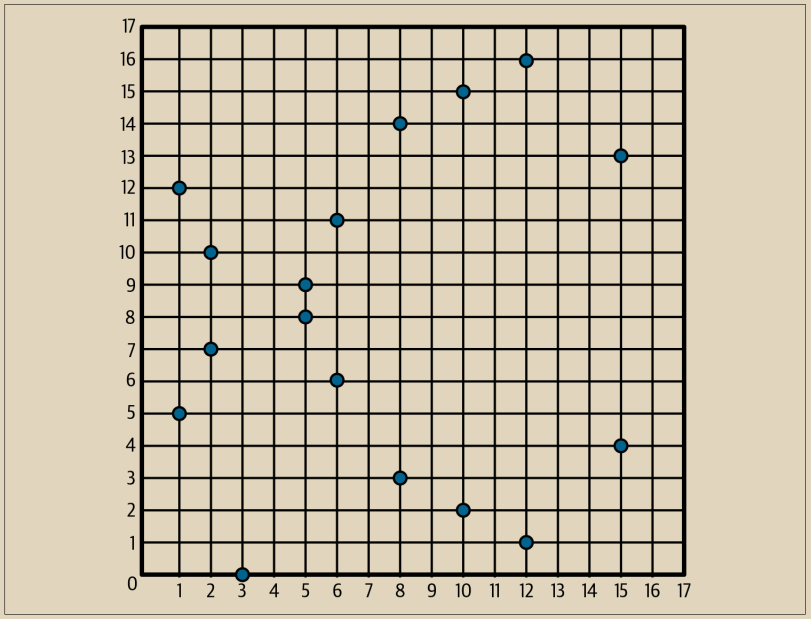 模 p(模质数 p)表示这个曲线是在一个素数 p 的有限域上,也写作 Fp,其中 p = 2^256 - 2^32 - 2^9 - 2^8 - 2^7 - 2^6 - 2^4 - 1,是一个非常大的素数。因为这个曲线是在一个素数的有限域上定义的,而不是在实数上,所以它看起来像是在二维空间中散布的点的模式,这使得它难以可视化。然而,数学上与实数上的椭圆曲线完全相同。举个例子,图 4-3 展示了相同的椭圆曲线在一个比较小的素数阶有限域 17 上的情况,显示了一个点在网格上的模式。Bitcoin 的 secp256k1 椭圆曲线可以看作是一个非常复杂的点模式在一个超大网格上。