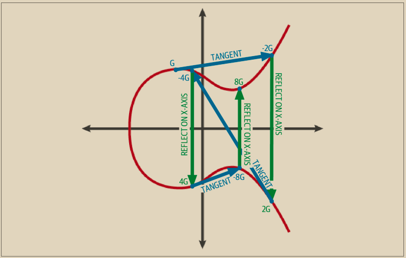 为了可视化点与整数的乘法,我们将使用实数上的简单椭圆曲线——请记住,数学是一样的。我们的目标是找到生成点 G 的倍数 kG,这等同于将 G 加上自身,连续 k 次。在椭圆曲线中,将一个点加到它自身相当于在该点上画一条切线,并找到它再次与曲线相交的位置,然后将该点在 x 轴上反射。&### x20;