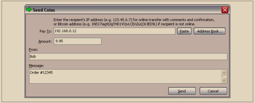 在比特币软件的早期版本中,允许支付者输入接收者的 IP 地址,如图 4-5 所示。这个功能后来被移除了——使用 IP 地址存在很多问题——但对它的快速描述将有助于我们更好地理解为什么某些特性可能被添加到比特币协议中。