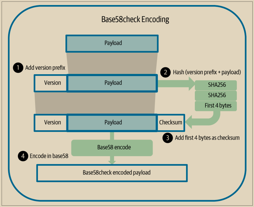 <figure><img src="https://img.learnblockchain.cn/masterbitcoin3/assets/4.6.png" alt=""><figcaption><p>图 4-6. Base58check编码:一种用于明确编码比特币数据的基于Base58、带版本和校验和的格式。</p></figcaption></figure>