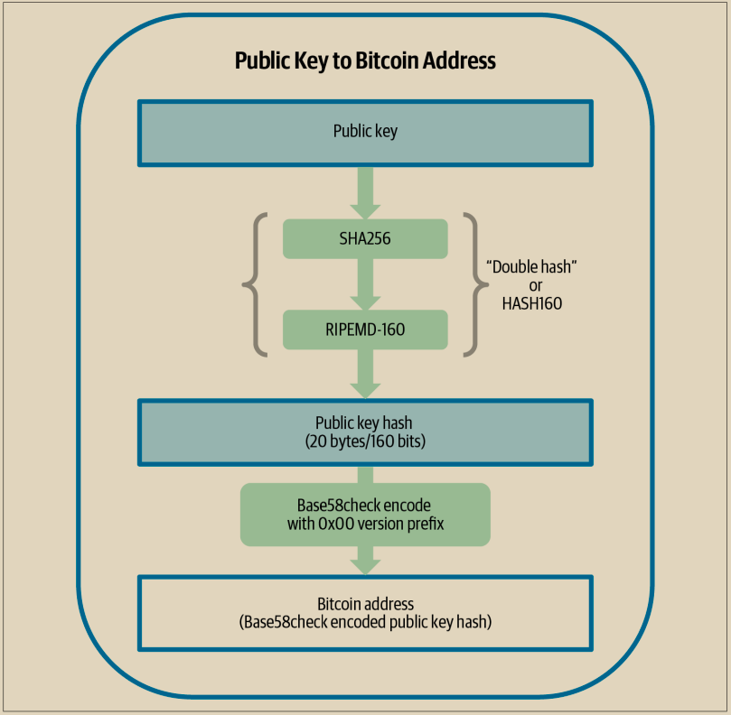 SHA256 哈希函数被认为非常安全,并产生 256 位(32 字节)的输出,不到原始比特币公钥大小的一半。然而,还有其他略微不太安全的哈希函数可以产生较小的输出,比如 RIPEMD-160 哈希函数,其输出为 160 位(20 字节)。由于 Satoshi Nakamoto 从未说明原因,比特币的原始版本通过首先使用 SHA256 对密钥进行哈希,然后使用 RIPEMD-160 对该输出进行哈希,从而对公钥进行承诺;这产生了对公钥的 20 字节承诺。