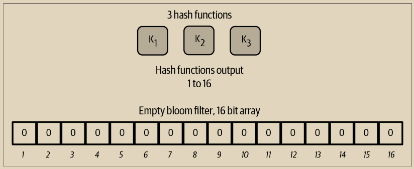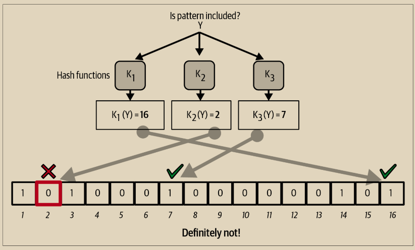 图10-10是对简单布隆过滤器中测试模式“Y”的存在性的示例。其中一个相应的位设置为0,因此该模式绝对不是匹配项。