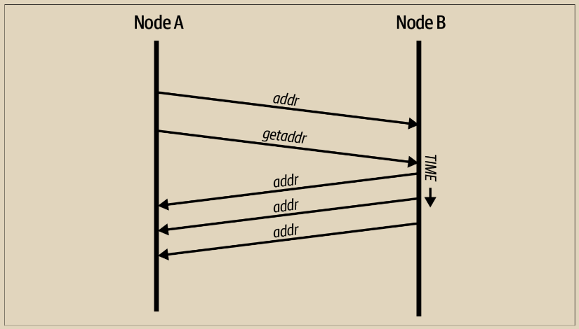 一旦建立了一个或多个连接,新节点将向其邻居发送一个包含自己 IP 地址的 addr 消息。邻居们将转发 addr 消息给它们的邻居,确保新连接的节点变得广为人知并且连接更加稳固。此外,新连接的节点可以向其邻居发送 getaddr,请求它们返回其他节点的 IP 地址列表。这样,一个节点就可以找到要连接的节点,并在网络上广告自己的存在,以便其他节点找到它。下图展示了地址发现协议。