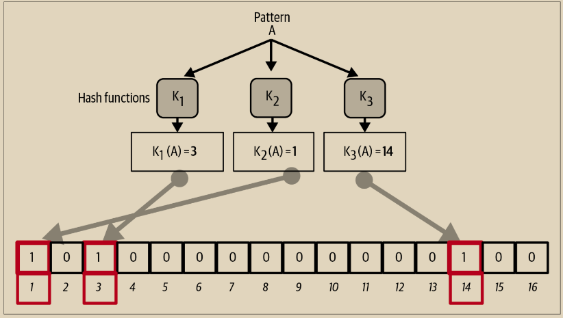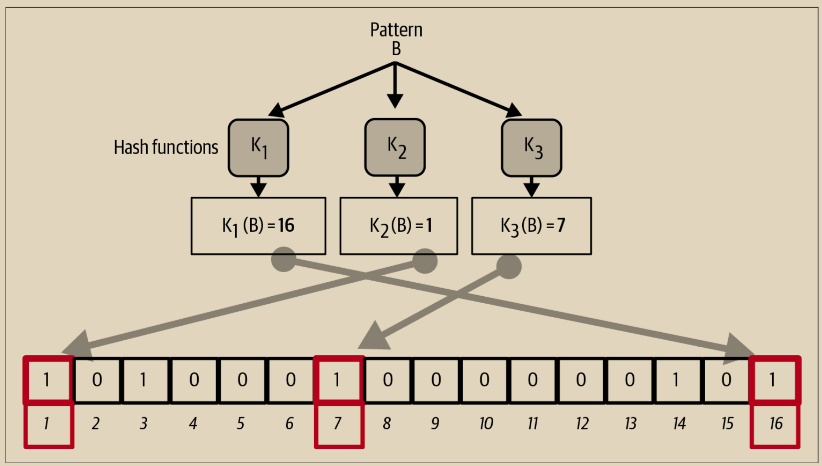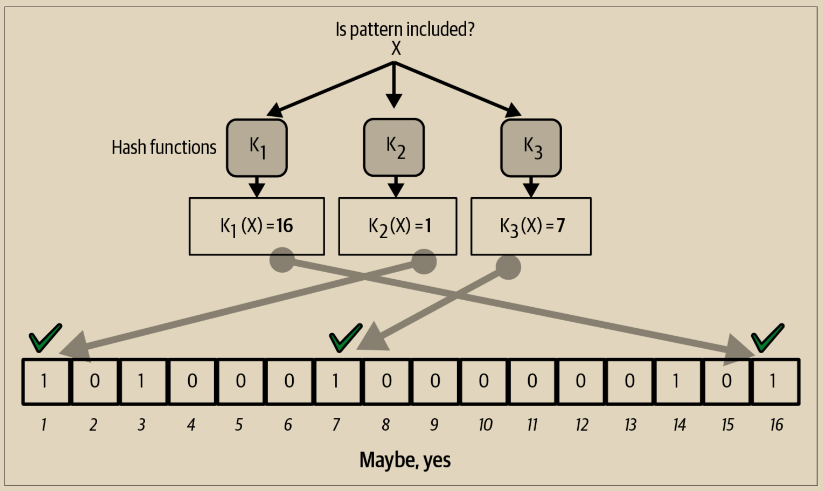 要测试一个模式是否存在于布隆过滤器中,需要对该模式应用每个哈希函数,并将结果与位数组进行比较。如果由哈希函数索引的所有位都被设置为1,那么该模式很可能被记录在布隆过滤器中。然而,由于这些位可能是由于多个模式的重叠而设置的,因此结果并不确定,而是概率性的。简单来说,布隆过滤器的正匹配是一个“也许,是”的情况。