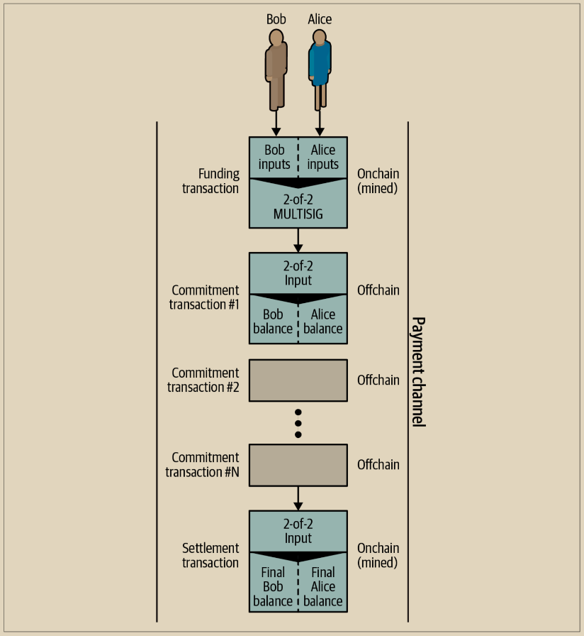 <figure><img src="https://img.learnblockchain.cn/masterbitcoin3/assets/14.1.png" alt=""><figcaption><p>图 14-1. Bob 和 Alice 之间的支付通道,显示了资金、承诺和结算交易</p></figcaption></figure>