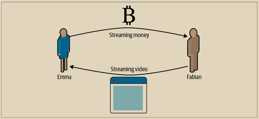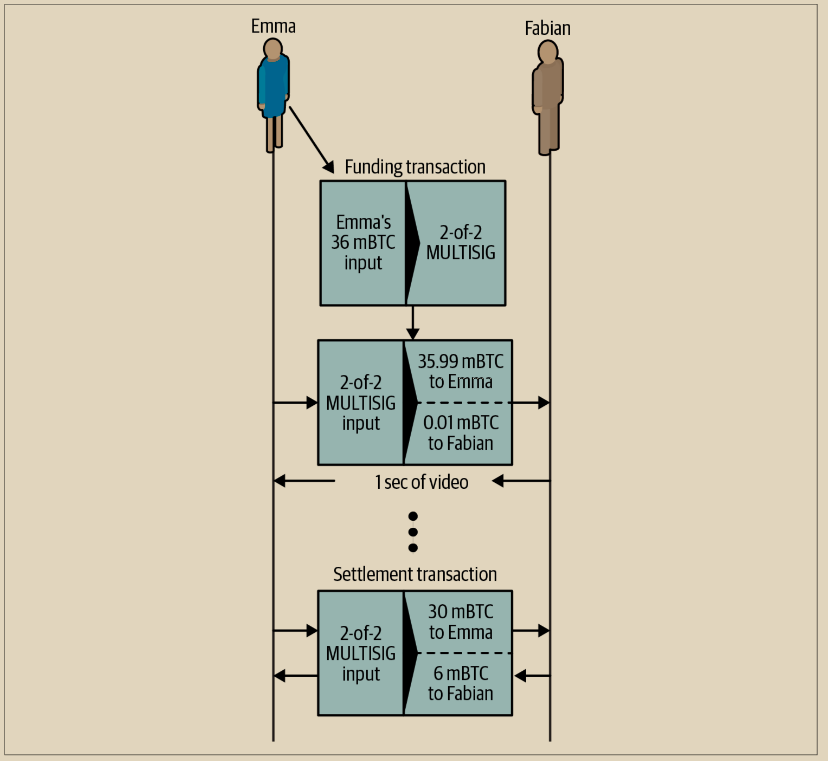 <figure><img src="https://img.learnblockchain.cn/masterbitcoin3/assets/14.2.png" alt=""><figcaption><p>图 14-2. Emma 使用支付通道购买 Fabian 的视频流服务,按每秒的视频付费</p></figcaption></figure>